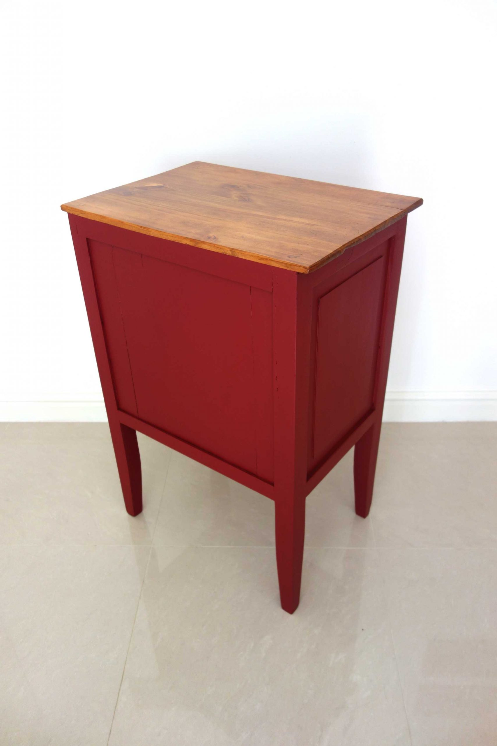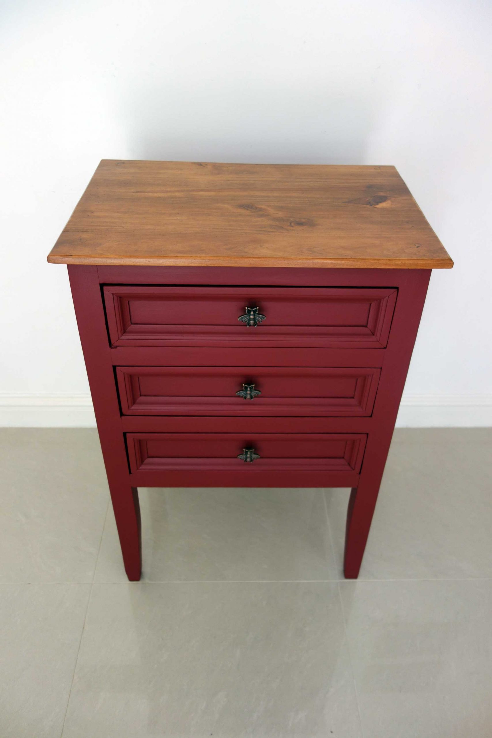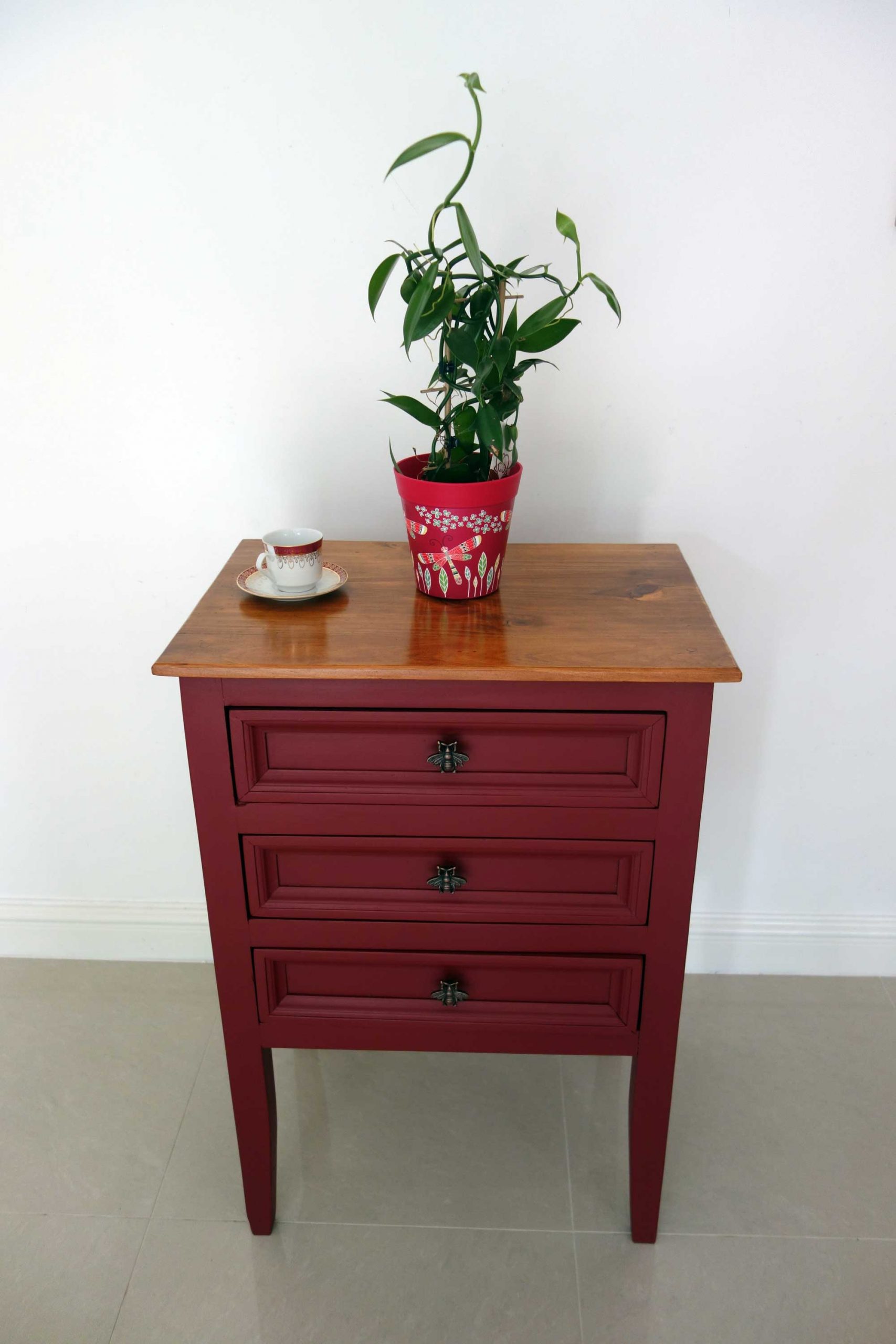 An upcycled side table, painted in cranberry, with an exposed wood top surface and quirky bee handles.