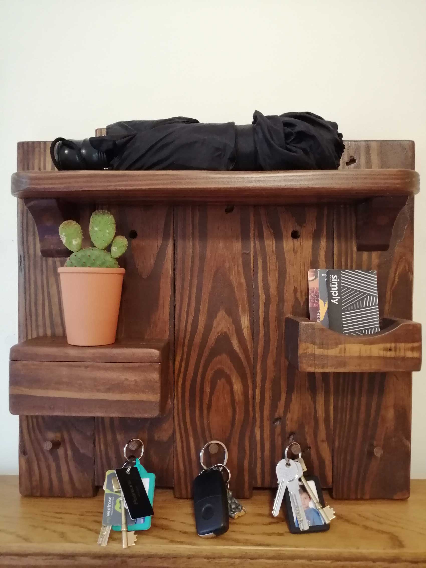 This reclaimed wood hallway organiser enables busy people on the go to achieve a clutter free and well organised hallway, where their important bits and pieces are always easily accessible.
