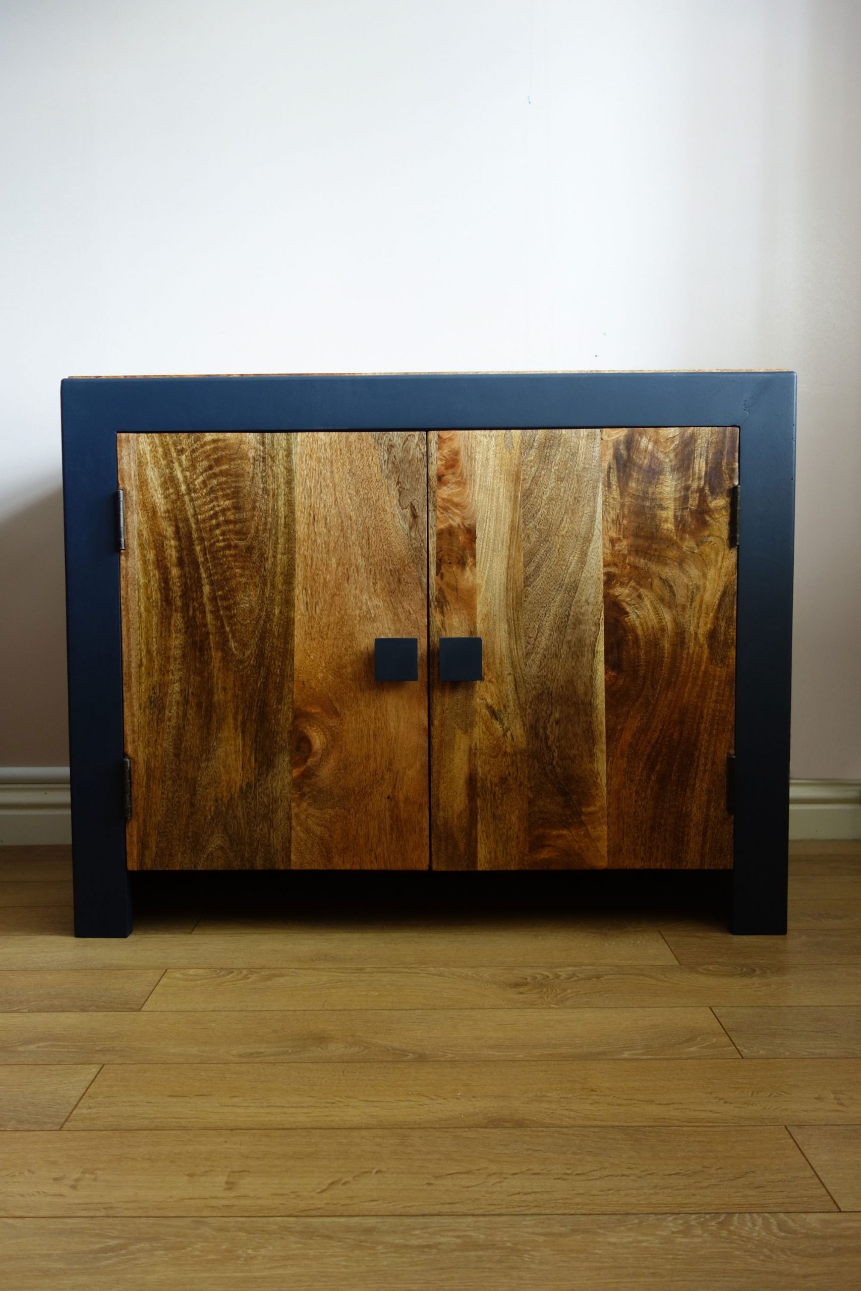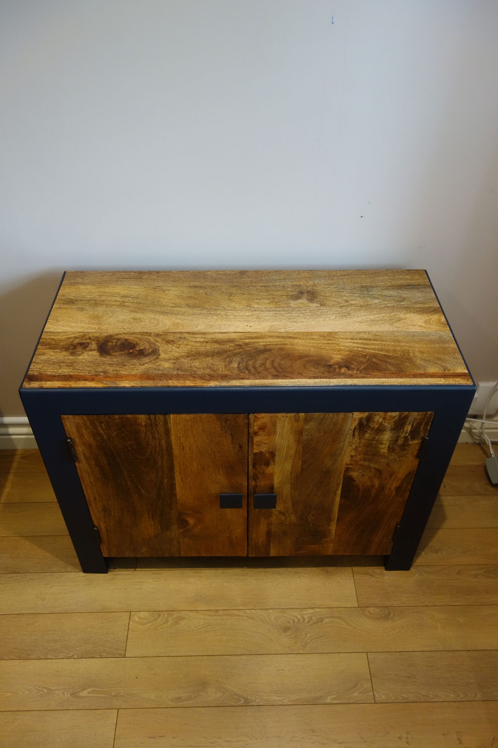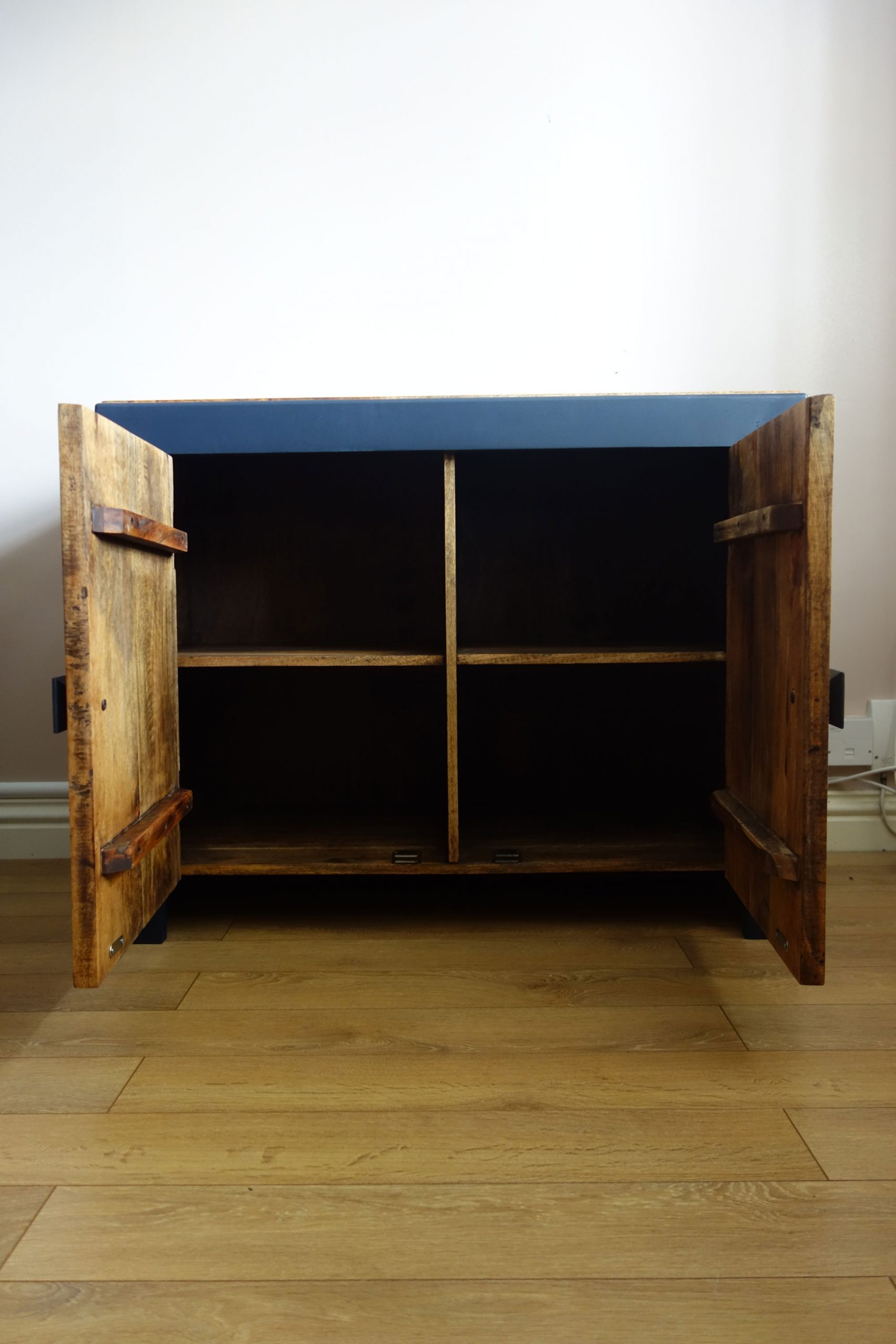 A solid mango wood sideboard, fully refurbished and ready to make a statement in its new home. Danish oil has been used to highlight the beautiful grain and add a protective layer. And to make this a one of a kind piece, midnight blue paint has been added to certain sections for a lovely contrast. The paint has been over-coated with beeswax to add further protection and a nice reflective sheen.