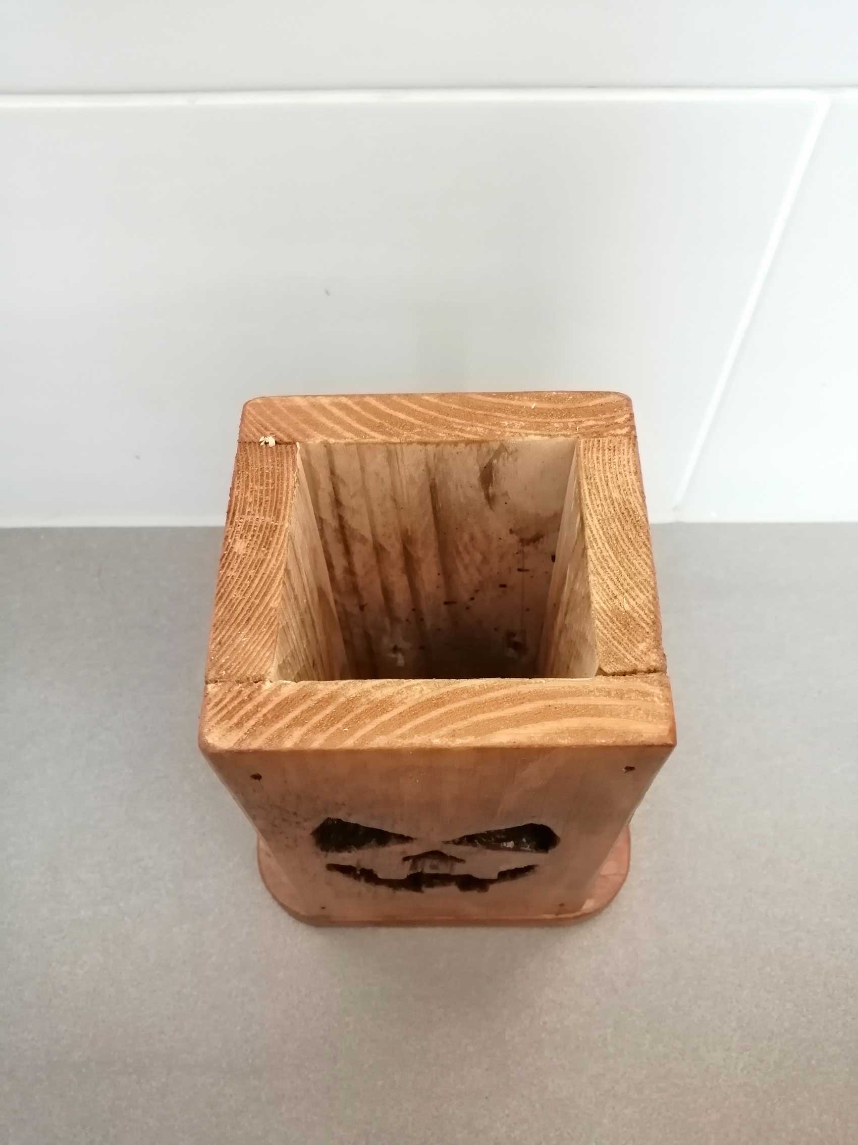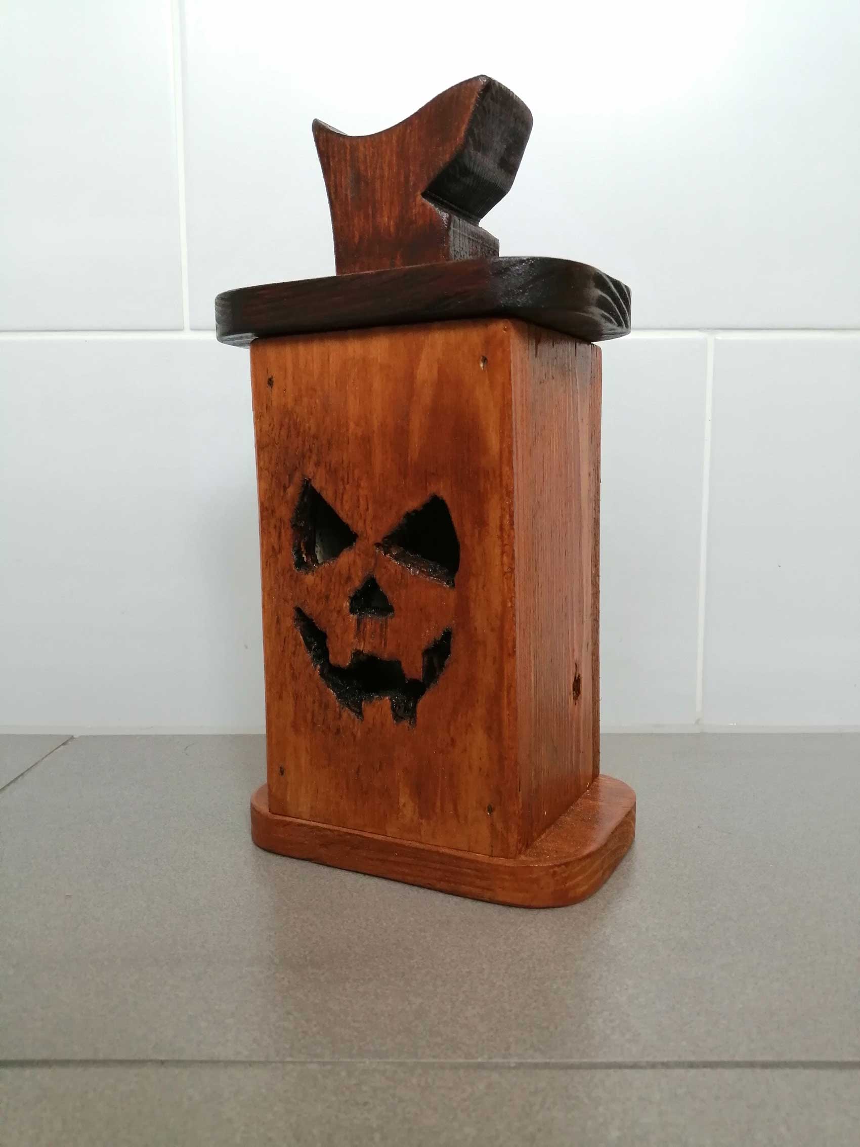 I wanted the hat to be removeable so that you could lift it up and insert a glo-stick or fairy lights. The design I came up with consisted of 3 pieces of wood, glued and screwed together, I got a bit fancy with the hat top, but if you don’t have a bandsaw you can use a coping saw, or just go with a simple block of wood.