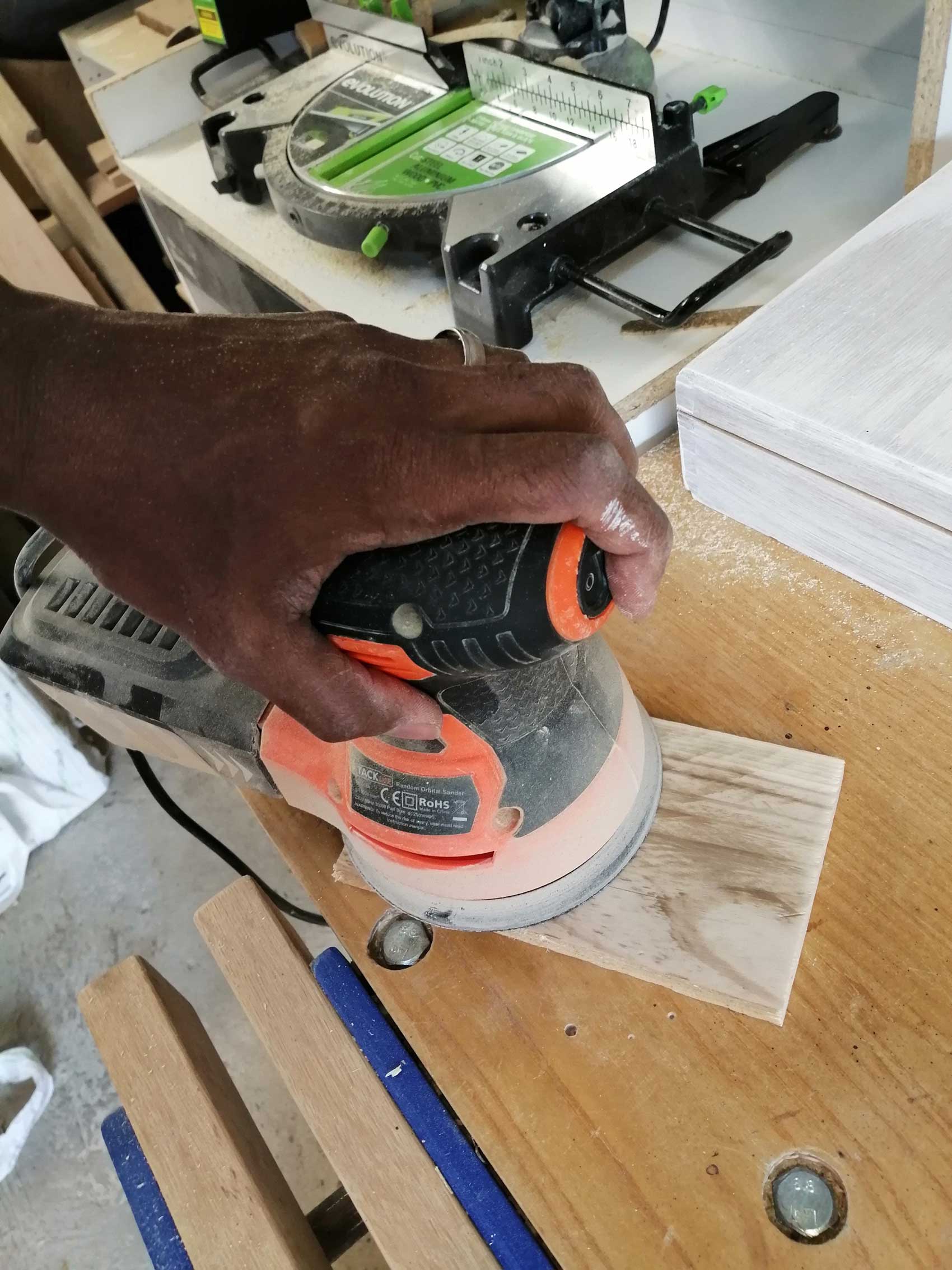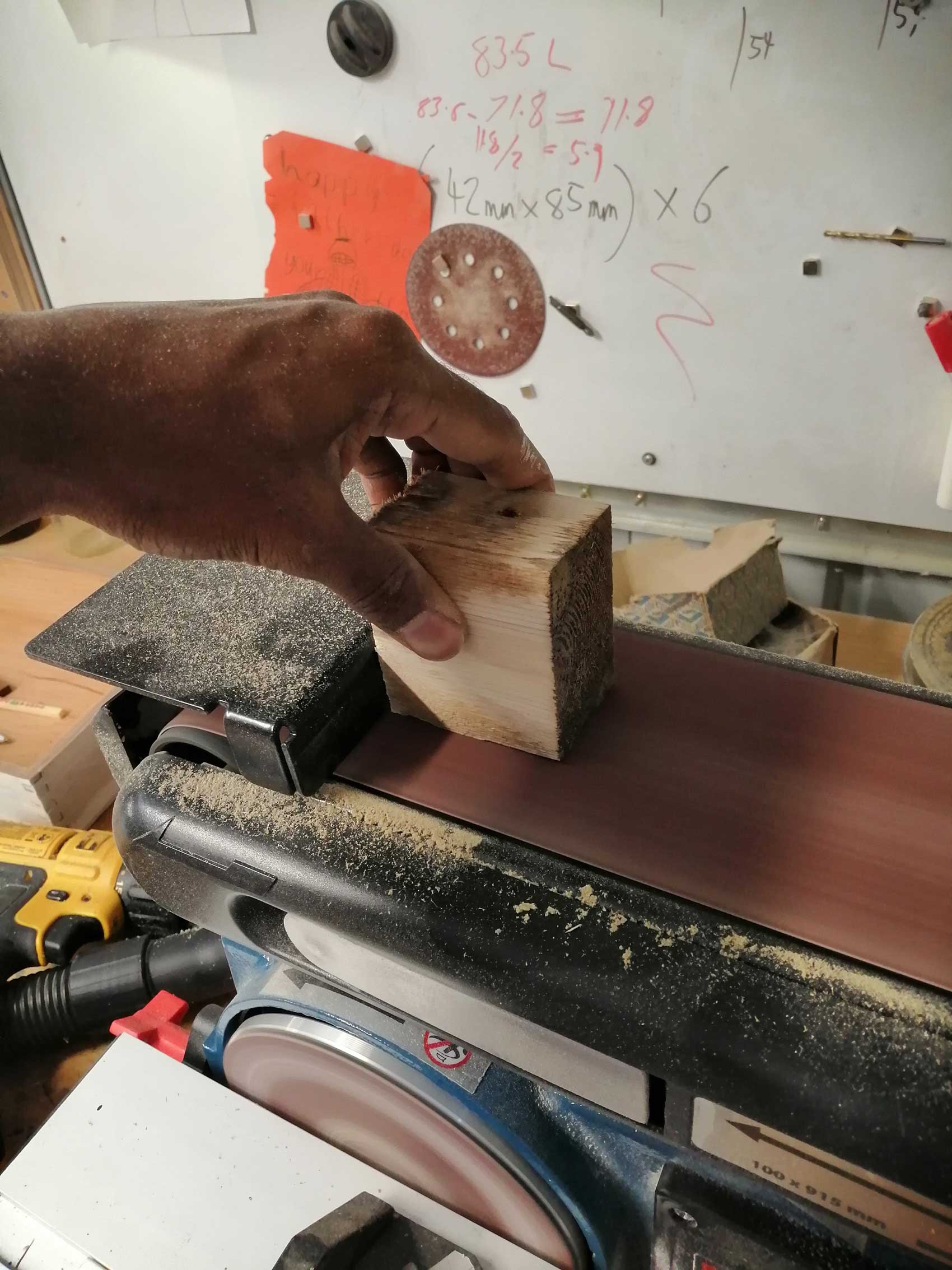 And then I took the rough surface off with the bench sander, followed by some finer sanding with the orbital sander. I didn’t go too fine though, I just went to 120 grit. I planned to stain it later and I like to leave a slightly rough surface for the colour to soak into.