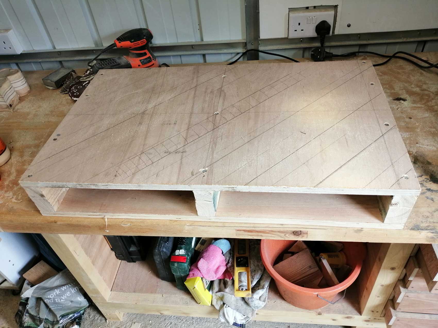 After taking the pallet apart with a hammer and crowbar, I combined a few of the thicker pieces with some scrap plywood using glue and screws. This formed an inner frame which was strong, level and square. Notice the diagonal pencil lines in the second photo. This marks out what the table top is going to look like.