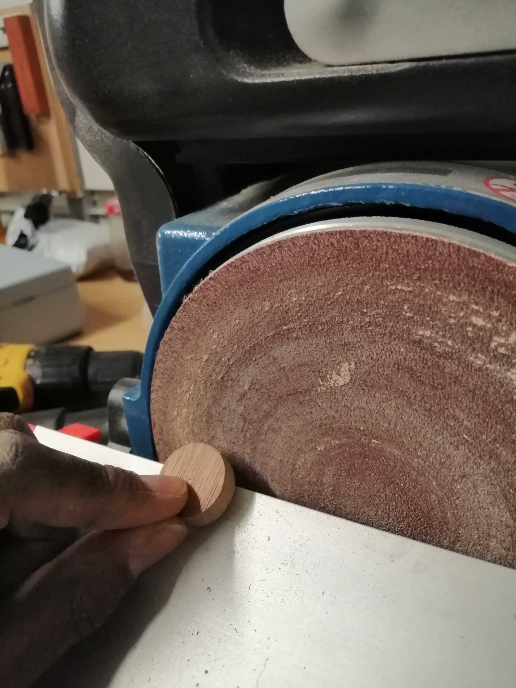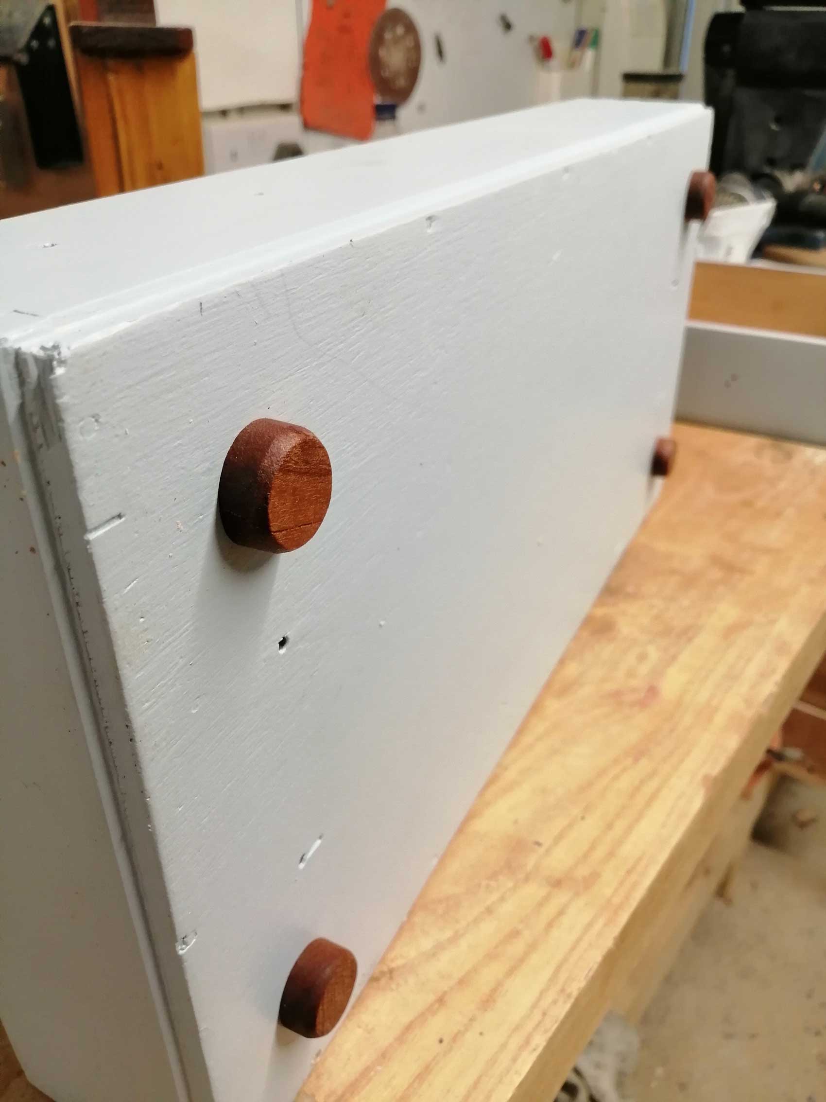 After googling sewing boxes I saw that some of the original ones had legs to raise them up off the work surface. I didn’t want to go that far, but I decided to add some wooden feet so that even the bottom of the sewing box would look amazing. And I went with the good stuff, I took a walnut offcut and cut out some small circles with the bandsaw. After sanding and staining I attached each foot with glue and a screw. This is my favourite part of the upcycle because it’s something that wasn’t there originally but it has greatly improved the overall look. It’s also functional because it prevents the painted bottom from constantly rubbing on a work surface.