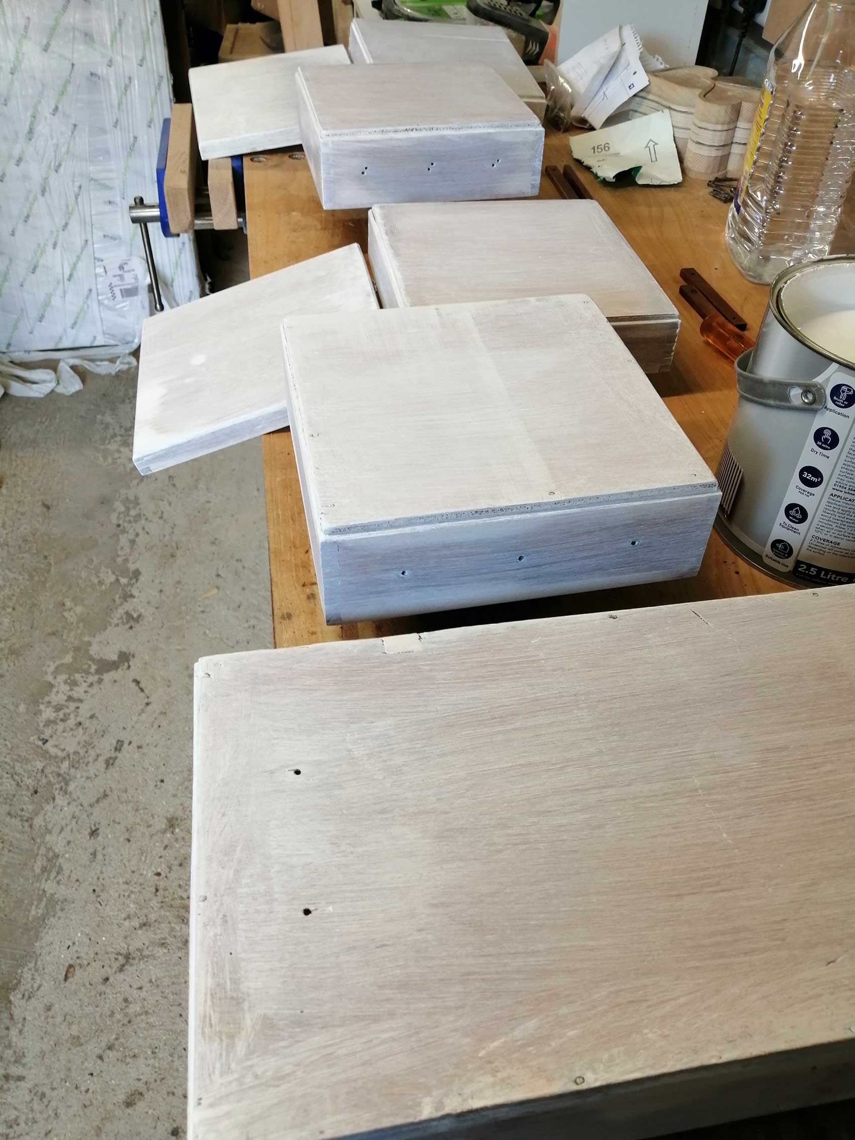 First I took lots of pictures to remind me how everything fit together. And then I took it all apart. This is where I started to see some issues. The hinges were loose, there were missing screws and washers, and there were some small cracks in the wood. I decided to stain the arm pieces in a dark colour, and paint the box light blue to give a nice contrast. You can see here the disassembled box with the first coat of stain applied to the arms.